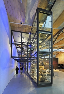 Open Depot The contextual points form a bridge to the so named ‘open depot’. The depot, a large glass wall vitrine 110 metres long, runs the length of the exhibition space and offers visitors an extensive overview of the collection. Here more than 3.500 objects are grouped in clusters following the chronological installation of the exhibition. Clusters support each zone, theme and contextual points with objects that relate to that period. The depot offers visitors the opportunity to explore a particular theme more in depth and demonstrates the richness of the collection. It is called the data bank of Twente history
