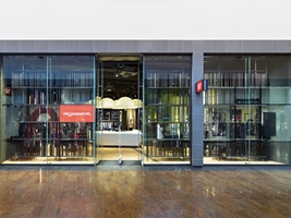 A leather-upholstered cashier’s console with a display space suitable for shoes and other accessories, stands in the middle of the store and measures 10 by 20 metres. The other furniture differs in form and finish and can be arranged in any desired configuration. In this way it is possible to alternate elements on an almost daily basis creating suitable displays for new products, special offers, etc. The chosen materials (parquet in a variety of patterns, smoked glass, textile, leather etc.) contribute - together with the innovative lighting - to create a warm atmosphere and a feeling of quality and luxury…