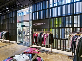 The store is deliberately designed without a typical window. Installed directly behind the glass façade are vertical wooden lamellas. These lamellas extend via the façade past the walls into the shop like an enormous folding screen – helping to create the feeling of being closed off from the rest of the shopping centre. The objective being to create an intimate, almost domestic atmosphere, with a theatrical accent. Naturally, the ultimate goal is to persuade the customer to spend additional time in the store, to fit and combine more items of clothing.