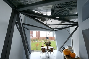 Achter de taatsdeur in de straatgevel loopt een trap binnen het lichaam omhoog naar de eerste verdieping en verder naar de tweede verdieping. Vanuit de woonkamer loopt er echter ook een tweede trap óver het lichaam naar de keuken/eetkamer. Deze buitentrap loopt zonder onderbreking door naar de derde verdieping: een roostervloer met een vrij programma. Aan de andere zijde van het lichaam loopt een laatste trap naar het dakterras.