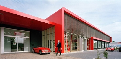 De glazen huid van de entreehal loopt als een vlak door in de glazen gevel van het kantoorgedeelte waardoor het kantoorvolume samensmelt met de entreehal. De vloeiend omgevouwen ‘rode slab’ is het structurerende element en verbindt de nieuwe entreehal met het kantoorgedeelte en de expeditie. De afrondingen van de ‘slab’ zijn indirecte verwijzingen naar gestroomlijnde objecten als sanitaire elementen maar ook naar auto-esthetiek.