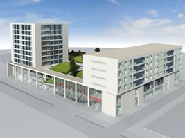 80 woningen, 2400 m2 Retail en 4000 m2 Supermarkt. Locatie: Bostonweg, Almere-Buiten