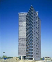 Aan het weerwater in Almere op een kruispunt van een aantal zichtassen is als stedenbouwkundig accent een woontoren voorzien. Een toren veronderstelt naast hoogte een zekere slankheid, die bij woonflats niet altijd wordt bereikt. Zeer zelden maken we een1 woning per laag! dus worden ze al gauw dik. Deze sterflat stamt uit een serie eerdere projecten, die ik in het verleden wel betiteld heb als 'toonladders in tunnelen'.Uiteindelijk is het een doorwerking van het koningin Wilhelminapleinprojekt en het niet gebouwde project Eltheto. Door steeds leniger om te gaan met de constructie kunnen we de woningen optimaler oriënteren op uitzicht en bezonning en ontstaat een uiterlijk waarin de dynamiek in de verticale gevelvlakken door verschillende richtingen wordt opgevoerd. Spitse verticale hoeken, als de boeg van een hoog schip, zijn daarvoor een expressief middel. Daarom is deze toren eerder prismatisch dan een koker. In feite is zij samengesteld uit drie om elkaar wentelende prisma's, reden voor de ontwikkelaar om haar naar een (geslepen) edelsteen te vernoemen: Tourmaline.