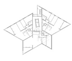 Uit de verte, vanuit de stad en haar grote aanvoerroutes, toont het gebouw zich keer op keer met een ander gezicht, verrassend en dynamisch. Dichterbij wordt pas duidelijk hoe het volume, verankerd aan zijn omgeving, gedistingeerd de vlucht probeert de nemen. Als een kristal rijst het gebouw boven de polder uit, op zoek naar de zon. Prisma's van glas en staal om een kern van steen zijn zo gebundeld dat het uitzicht vanuit de woningen op het Weerwater optimaal is. De stervormige plattegronden met lichte hoekverdraaiingen geven het volume op zodanige wijze vorm dat het silhouet zeer afwisselend is: soms rank en scherp als een mes, en soms breed en open als een waaier. Een “warme” sluier van hout, subtiel geweven, dekt de zilveren massa's. Aan de NO en NW-gevels is het hout verticaal geleed en bijzonder geprofileerd om het ochtend- en avondstrijklicht op te vangen. Door de kleurverwantschap met de steen sluiten de stijlen zich tot één vlak met de stenen wanneer je ze overhoeks ziet. De zuidgevels zijn daarentegen sterk horizontaal vormgegeven, om de horizon van binnenuit te kunnen volgen. Hier versterkt juist het hout de richting van de bandramen en verzacht het harde karakter van de materialen glas en staal.