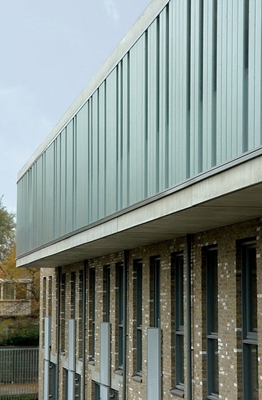 In de gevels wisselen vlakken van metselwerk, western red cedar en vezelcementplaten in betonstructuur elkaar af. De steen is geelwit genuanceerd met een wat ruige uitstraling. Het hout, western red cedar, is met een iets transparante blauwgrijze coating afgewerkt. De bergingenblokken hebben een gevel van glasprofielen met translucente isolatie. 's Avonds zijn deze blokken verlicht en markeren de entrees. De overige galerijen, de uitkragende balkons en de lateien in het metselwerk zijn uitgevoerd in wit prefabbeton. Strekmetaal is ingezet om op sommige plekken een open hekwerk te maken en ook bij de franse balkons. De panelen lopen daar soms door tot maaiveld en bieden op deze manier houvast aan klimplanten. De ‘zorgvilla’, tussen de poten van de zigzag, voegt zich als een los object in de reeks van vrijstaande woningen aan de Olmenlaan. Het programma bestaat uit een dagopvang en de gemeenschappelijke ruimte met grand café op de begane grond. Dit café is ook voor bewoners uit de buurt toegankelijk. Op de eerste en tweede verdieping bevinden zich personeelsvoorzieningen en twee appartementen.