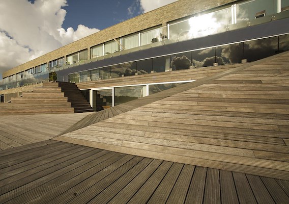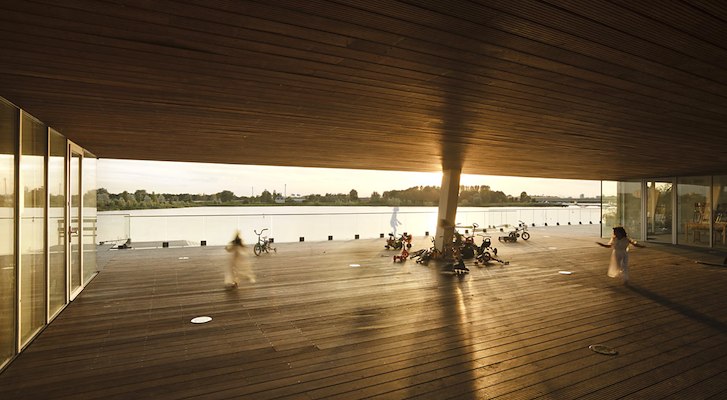De opening dient tevens als een royaal overdekt collectief terras dat aan de waterzijde als een glooiend tapijt naar beneden beweegt. Eenvoudig toegankelijk voor de bewoners en zo worden ontmoetingen geënsceneerd. De ingreep in het gebouw zorgt tevens voor een differentiatie in woningtypologieën.