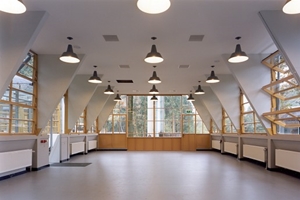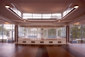 In de congreszaal boven is het bijzondere patroon van twee kleuren linoleum teruggebracht, dat de inrichting van de zaal structureerde. Hiertoe zijn twee kleuren uit het authentieke kleurengamma door ons bureau herontworpen en speciaal geproduceerd. De zaal kan met hardglazen schuifwanden worden onderverdeeld in kleinere vergaderruimten.