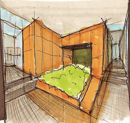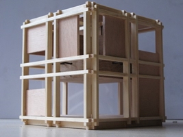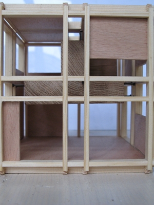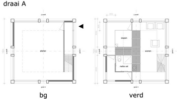 In de prijsvraag atelierwoning bedachten we een skelet dat in setting, oriëntatie en ruimtevorm generiek is door het te verplaatsen, te kantelen of te draaien. Een stalen skelet met daarin een organiserend ‘meubel’ deelt de binnenruimte op in vier verschillende ruimteafmetingen. Dit geeft de mogelijkheid tot het creëren van een atelier op de verdieping of op maaiveldniveau, een atelier met dubbele hoogte, wonen beneden met tuin of boven met dakterras of juist een atelier met tuin.
