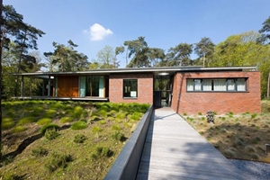 Een bosrijk en geaccidenteerd terrein vormt de drager van het plan voor dit woonhuis. Het ontwerp is in zijn compositie en architectuur een overtuigende reactie op deze prachtige locatie. Niveauverschillen binnen en buiten de woning vormen naast een grote transparantie en ruimtelijkheid de karakteristiek van dit woonhuis. Grote overstekken en ruime terrassen geven extra vorm aan de overgang tussen binnen en buiten.