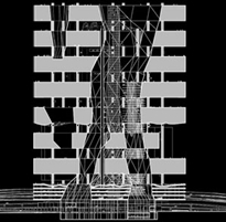 This is the biggest Infrabody with the smallest footprint we have ever planned. The programming of such a location in such a massive scale is without precedents. Its density is beyond our present day comprehension. Its time window is around 2030. The Compressor consists of stacked slabs of city and reaches a height of about 300-meter. It brings together programs in a dot under high pressure and it makes urbanism inevitable. To program the Compressor, we perforated it with various kinds of atriums for the admittance of light and air and linked it to various types of infrastructure. Its sheer mass exploits the existing traffic square. The resulting density inside forces all infrastructure to the vertical plane. The five floors of the interface take care of all incoming and outgoing traffic by prosthetics connected to the surroundings for public transport, trucks, cars, metro, bus, pedestrians and cyclists. It takes care of tilting the massive traffic flows from the horizontal to the vertical. The floor fields of the Compressor can be considered landscapes with a variety of qualities such as daylight, fresh air and panoramic views. These qualities create zones for specific programs like housing, working spaces, offices, commercial programs, recreation and parking. Obviously housing is nesting along the outer perimeters of the slabs. The root shaped atrium is placed within the infrastructure bundles, is structurally stabilising and provides air, light and views. The slabs of city all have a topside that can function as a public soil. It is possible to program these with landscapes, parks, squares, swimming pools and sports facilities. A high-rise traditionally includes a relatively big core. This core destroys the efficiency of the floor plans. In the compressor we atomised the core. It is exploded in ‘small’ particles and spread over the complete surface. We can do this by using the gigantic columns as tubes, supporting the slabs and at the same time functioning as infrastructural elements: structure becomes infrastructure. The columns are big enough to accommodate emergency stairs, services, etc. Each column supports a ring of elevators around its perimeter. The car elevators are combined in a tower and transport vehicles to a 150-m. height. The vertical boulevard runs through the main rootshaped atrium and is programmed with urban facilities. A structural grid along the boulevard is covered with a cloud of gondolas. These gondolas travel horizontally as well as vertically, programmed to avoid each other. Compared to traditional elevator systems many more ‘vehicles’ can travel in a vertical slot and the problems with stretching cables are solved.