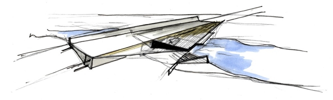 De hoek van de brug komt overeen met het perspectief van het oog. Daardoor wordt de brug vanaf de parkzijde als twee keer zo lang ervaren terwijl vanuit de woonwijk een oneindige indruk ontstaat.