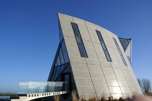 Een klein kantoorgebouw met woonstudio, op het industriegiebied Westpoort te Groningen, wordt in haar hoofdvorm bepaald door de driehoekige kavel. Deze vorm, de licht gebogen gepolijste betonnen schilden (hoogstandje van het moederbedrijf HIBEX) en de openingen op de koppen geven het gebouw een autonoom karakter.