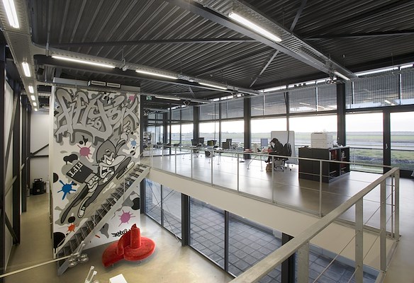 Onze opdrachtgever had de volgende wensen; creëer maximaal uitzicht en maximale zichtbaarheid aan de A7 bij Joure en geef vorm aan onze platte organisatie en huisstijl. Het gemaximeerde budget in relatie tot de gevraagde omvang vormde de belangrijkste uitdaging. De keuze voor één simpel volume voor zowel het distributiecentrum als de kantoorruimten, geeft vorm aan de platte organisatie, waarbij geen onderscheid wordt gemaakt tussen bedrijfshal en kantoordeel. Het vrijwel gesloten, in zwart geprofileerde sandwichpanelen opgetrokken gebouw, is in de breedte ontwikkeld en opent zich maximaal op de snelweg en het groene Friese landschap en vestigt tegelijkertijd de aandacht op de voorbijrijdende automobilist. Aan de snelwegzijde is het gebouw dan ook volledig transparant. De kleuren zwart en wit, de huisstijl van Fiftysix, een winkelketen in merkkleding voor jonge, modebewuste vrouwen, maakt het gebouw tot een duidelijk statement en contrasteert scherp met het groene landschap.