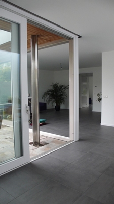 De bewoners hebben besloten niet een nieuw huis te bouwen, maar het huis dat staat op de plek waar ze willen blijven wonen maar wat niet bij hen past zo te transfomeren dat het aansluit bij hun wijze van wonen en ruimtebeleving. Centraal komt hierbij de tuin te liggen. Alle nieuwe ver-blijfsruimtes vouwen zich om de tuin heen. Een overstek en grote te openen puien maken het mogelijk dat binnen en buiten met elkaar verbonden worden. Het element in de keukenpui, welke aan de tuinzijde een haard herbergt en binnen een werkblad vormt, verstevigd deze verbinding. Om een subtiel contrast met het bestaande woning te bewerkstelligen is de uitbreiding opgetrokken uit grijs keimwerk en zinken dakranden, oud en nieuw blijven zo zichtbaar en complementeren elkaar.