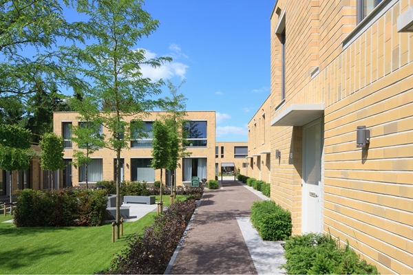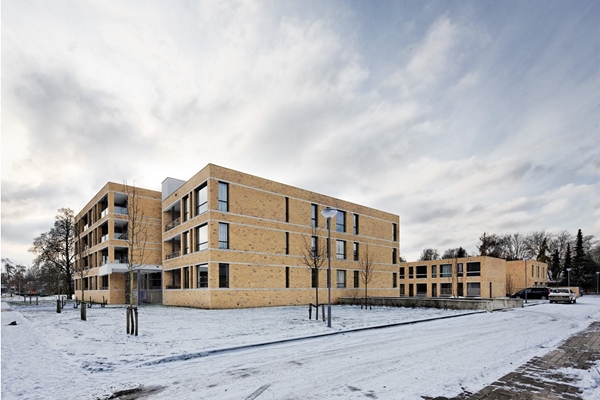 Het totale woonprogramma is in kleinere volumes opgedeeld: een zorgcomplex met 16 zelfstandige wooneenheden, 10 patiowoningen en 22 appartementen. Met de lagere volumes van het zorgcomplex en de patiowoningen wordt een overgang gemaakt naar de naastgelegen villa’s. Op de hoek van het perceel, aan een waterloop, wordt het appartementencomplex geplaatst. De gezamenlijke ruimtes in het appartementencomplex lopen tot de gevels, delen zo de massa in kleinere volumes op.