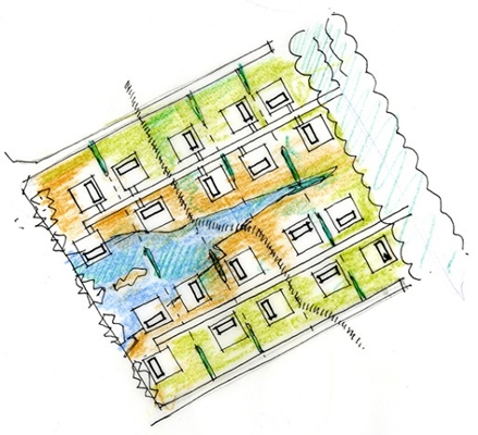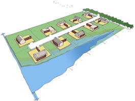 Een drassig veenlandschap dient als drager voor voor het gehele plan. Op deze drager is het casco (ontsluitingen en de waterstructuren) gelegen. Hierop wordt een verkavelingsprincipe gehanteerd dat is opgebouwd uit drie niveau’s: het ruimtekavel, de tuinkavel en het bouwkavel. De toekomstige bewoner koopt een stuk veenlandschap, het ruimtekavel. Daarbinnen is een verhoogd tuinkavel gelegen waarop twee ‘turfmuren’ zijn geplaatst die zorg dragen voor privacy en een inkadering van het uitzicht. Op de tuinkavel is uiteindelijk het bebouwingskavel gepositioneerd. Met deze ontwerpingrepen ontstaat een stedenbouwkundig voorstel voor twintig woningen in het landschap dat voor de bewoners een unieke ruimtebeleving biedt en dat als geheel sterk genoeg is om een grote diversiteit aan woningtypen in zich op nemen. Er ontstaat zo een plan dat uniek en tegelijkertijd typisch Helenaveens is.