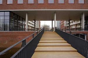 Een brug brengt u naar de parkeerlaag waar veel groen en daglicht de binnenkomst veraangenamen. Een tweede brug, voor voetgangers, leidt naar het niveau van het binnenplein. Dit plein is voornamelijk in hout uitgevoerd, met uitzondering van het middelste gedeelte dat omzoomd is met bomen. Decoratieve, stalen roosters vormen het vloergedeelte. De lichte en vriendelijke gevels van de binnenzijde van de bouwblokken vormen een scherp contrast met de meer robuuste buitengevel. Voor de buitenzijde en de plint van het gebouw is een stevige roodbruine steen gebruikt. De kozijnen en hekwerken krijgen dezelfde kleur als het metselwerk. Hierdoor ontstaat een harmonisch geheel.