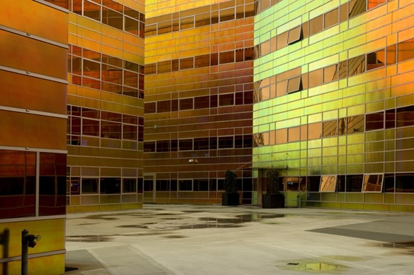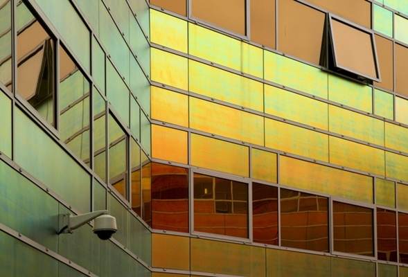 De gevelbekleding aan de straatzijde is zilverkleurig, het gebouw valt daardoor nauwelijks op in een omgeving die voornamelijk bestaat uit grijze bakstenen gebouwen. Op twee plaatsen wordt de gevelwand aan de straatzijde onderbroken, waardoor de gevels aan de binnenzijde zichtbaar worden. Deze zijn beplakt met een folie die ontwikkeld werd voor parfumflesjes, maar daarvoor nooit gebruikt is. Fabrikant 3M wilde de folie alleen in productie nemen bij een hoge gegarandeerde afname. Omwille van de folie is daarom het geveloppervlakte vergroot.
