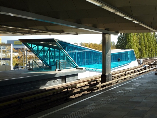 Het lijnenspel in de gevel wordt gevormd door een fluorescerende glaskap en een gesloten brugdeel. Het contrast tussen open en besloten en donker en licht levert zowel overdag als ’s avonds een gevarieerd beeld.