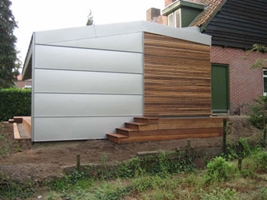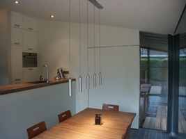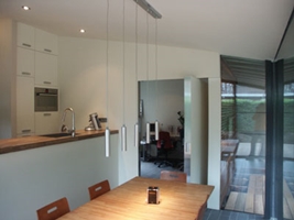 De nieuwe uitbouw voor de woonkeuken en werkruimte is een object dat zich opent naar de tuin. Ten opzichte van de bestaande woning is de uitbouw verdiept aangelegd zodat de relatie met de tuin meer direct aanwezig is. Vanuit de bestaande woning daalt men af in de uitbouw. Deze afdaling wordt versterkt door het schuine aluminium dak .
