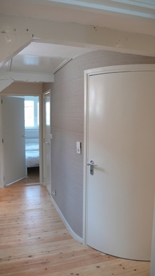 De afgeronde wand is op de overloop een duidelijk element dat de twee kamers met elkaar verbindt.