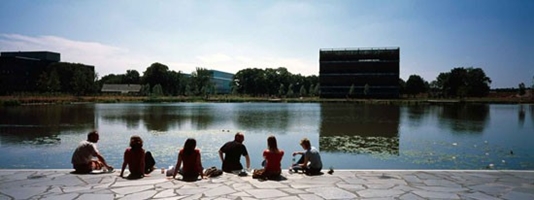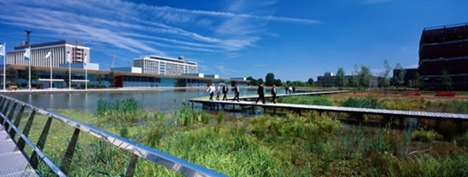 Om de technologische basis van Philips uit te bouwen en internationale allure te geven, is besloten om de terreinen rond het Natuurkundig laboratorium uit te bouwen tot de High Tech Campus Eindhoven. Het concentreren van bedrijfsactiviteiten dient een tweeledig doel: het stimuleert de interne samenwerking tussen medewerkers en versterkt het corporate image van Philips. Bij het ontwerp van de Campus heeft het creëren van een inspirerende werkomgeving en het versterken van het contact tussen de medewerkers voorop gestaan. De ambitie van het werken in een landschap wordt gerealiseerd door de 6000 parkeerplaatsen in tien parkeergebouwen te concentreren. De parkeergebouwen zelf maken ook onderdeel van het landschap; in het noordelijke deel zijn ze vormgegeven als groene dozen, in het zuidelijke deel zijn ze opgenomen in de geluidswallen langs de snelweg. Doordat het groen naadloos tot aan de transparante kantoren kan worden doorgezet, heeft iedere werknemer uitzicht op het landschap. Dit landschap is vormgegeven op basis van de geomorfologie; in het noorden het Dommeldal en het transparante bos en in het zuiden het heidelandschap. Tussen het transparante bos en het heidelandschap ligt het kloppend hart van de Campus, de Strip aan de plas. De programmering met bedrijfskantines, een congrescentrum, vergaderunits, kleine supermarkt, een dokterspraktijk en een fitnesscentrum maakt de Strip ‘the place to be’. Aan de zuidzijde van de Strip ligt een wandelpromenade in de zon. Deze kade is verbonden met het centrale plein: de Campusplaza. Kade en plaza zijn voorzien van een Noorse Leisteen die de bijzonderheid van de Strip benadrukken. Aan de noordzijde van de Strip ligt een brede laan die de formele entree vormt van de Campus. Door combinatie van de Strip, de parkeergarages en een sportbos in het westen ontstaat een levendig landschappelijk terrein waar veel beweging en interactie tussen de werknemers is.