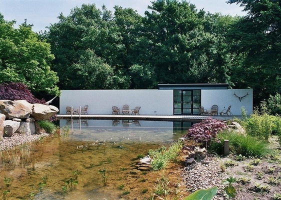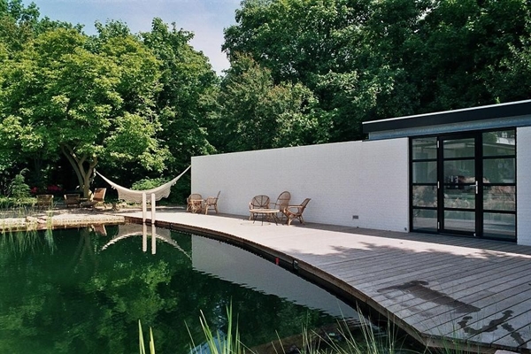 Vrijstaande villa uit 1939 heeft door zijn hoge ligging een uniek uitzicht over het rivierenlandschap. Het exterieur van de villa is gerestaureerd en voldoet aan de hedendaagse bouwfysische eisen. Daarbij is het karakter van de architectuur uit de jaren 30 behouden. De tuinzijde met het uitzicht over de rivieren is op het zuiden georiënteerd. Om het uitzicht in de woonkamer te behouden als de zon naar binnen schijnt, weert de luifel de directe zonnestralen maar laat het licht door. Ter plaatse van de eetkamer gaat de luifel over in de veranda. Ten behoeve van de zwemvijver is er een badhuis gebouwd in de stijl van de villa.