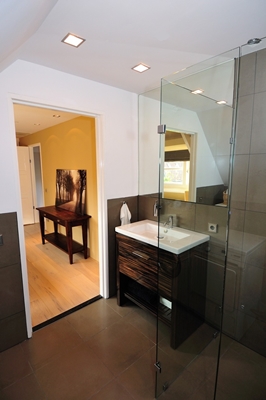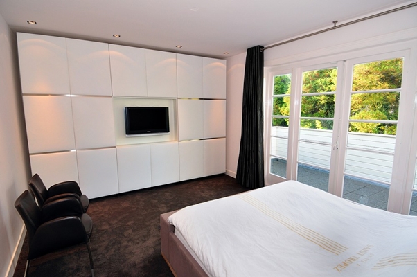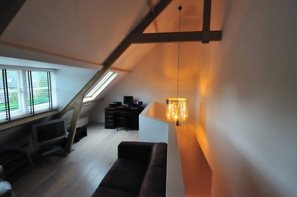 Het huis krijgt door de uitbouw een ruime woonkamer met open keuken. In de master bedroom heeft rondaywinkelaar een kastenwand op maat ontworpen. Dekastenwand is bekleed met wit leren kussen in combinatie met rvs strippen. De binnenkant van de kast is voorzien van kledingliften. Op zolder bevindt zich een slaapkamer voor gasten met en-suite een badkamer in de stijl van de badkamer op de eerste verdieping.