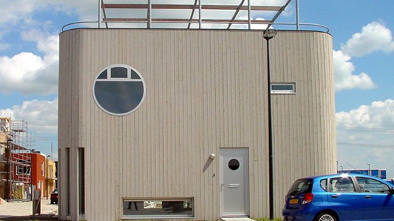 Deze woning is ontworpen voor een waterlokatie op Steigereiland in IJburg waar de gemeente een aantal vrije kavels heeft uitgegeven voor zelfbouwers. De waterwoning bestaat uit een drijvende, twee meter diepe betonnen bak met daarop een houten opbouw. De buitenzijde is bekleed met een antraciet zwart plaatmateriaal. Het woongedeelte toont zich als een uitsnede in dit volume. Aluminium schuifdeuren en houten betimmering zijn hier oranje van kleur. De woning is gebouwd in een scheepswerf in Diemen en is naar IJburg versleept. De eigenaar bouwt daar ter plekke de woning af.