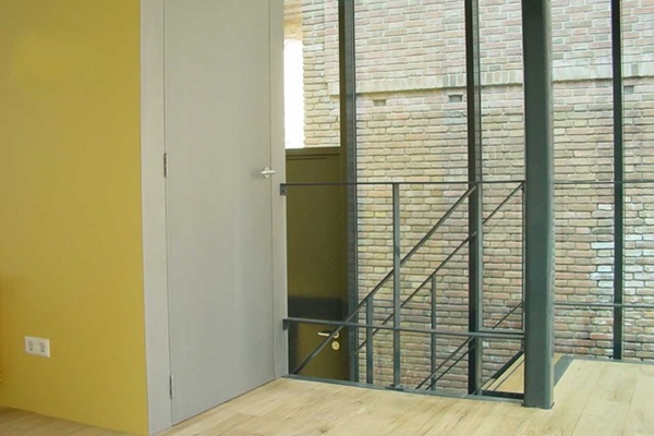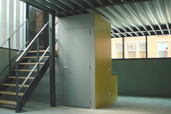De stalen kolommen rusten op een onder maaiveld gelegen kelderbak en staan een stuk achter de buitengevel. De buitengevel overspant van dakrand tot kelderbak. Ook de tussenverdieping is aan drie zijden los gehouden van de gevel. Daglicht dringt zo rijkelijk tot in de onderste verdieping door. Er is dan ook geen sprake van een ‘souterrain/bel-etage relatie’, maar beide ruimtes zijn, hoewel verschillend van karakter, sterk op elkaar betrokken en gelijkwaardig. Van binnen zijn de ruimtes licht en open. Grote glasvlakken kaderen het zicht op buurpanden, zowel aan de zij- als aan de overkant. Glas, staal en hout worden in hun pure en onbehandelde staat toegepast. In de gele, vrijstaande kern bevinden zich toilet, cv en bergruimte en een pantry. Deze loopt dwars door beide ruimtes.