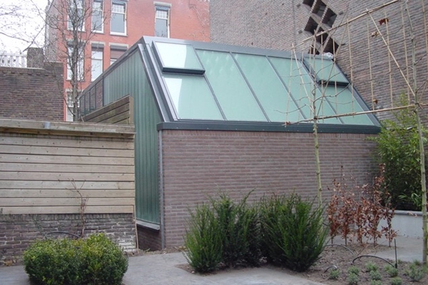 Deze praktijkruimte is gebouwd op de plaats van een oude garage in een bouwblok ontworpen door de Amsterdamse School architect Van der Mey. De begane grondvloer is een meter onder het maaiveld geplaatst, zodat een uit twee bouwlagen bestaand volume kon worden gerealiseerd. Om een volledig vrije gevel mogelijk te maken is er gebruik gemaakt van een draagconstructie in staal.