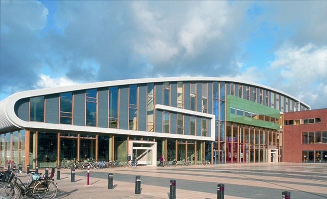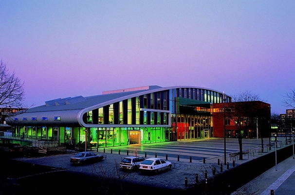 Dit is een multifunctioneel complex in het centrum van Huizen. Wonen, werken, een bibliotheek, horeca, een bowling, een bioscooptheatercomplex en een dansgelegenheid zijn ondergebracht in één gebouw direct naast het gemeentehuis. Deze functies zijn zodanig gecombineerd dat ze elkaar wederzijds aanvullen en versterken. De vorm van het gebouw is mede ingegeven door de wens de samenhang van de omgeving te versterken en het centrum van de gemeente meer betekenis te geven. Door de horizontale gebogen wand aan oost- en noordzijde wordt de nu nog wat rommelige openbare ruimte geordend. Aan de westzijde wordt op de kleinschaligheid van het historische dorp gereageerd. Het complex valt uiteen in 2 hoofdvolumes en is ingedeeld in 3 programmatische zones. Het woon- en werkvolume lijkt zich onder het dak van het cultuur- en uitgaansvolume voort te zetten en culmineert vervolgens in een Grand Café. Het cultuur- en uitgaanscentrum is opgevat als een ruimtelijk continue container van activiteiten en functies met een hoogtepunt tegenover het busstation en direct naast de entree van het gemeentehuis. Met deze vloeiende ruimtevorm wordt zowel het complexe programma van geplande activiteiten georganiseerd als ingespeeld op de grote verschillen in schaal en functie van de directe omgeving.