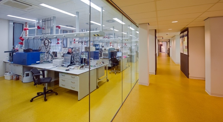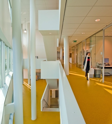 De nieuwbouw is in de oksel van het bestaande labgebouw geplaatst en door middel van een aantal bruggen met elkaar verbonden.