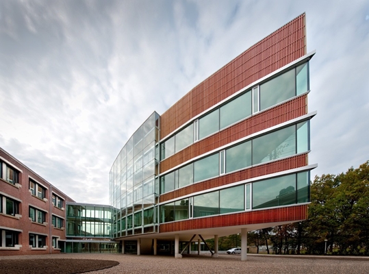 Door de nieuwbouw op poten te zetten en de onderbouw transparant vorm te geven met daarin de meest representatieve en openbare functies, ontstaat er levendigheid en doorzicht naar het bestaande gebouw op straatniveau. De buitenruimte onder de nieuwbouw loopt door tot tegen het bestaande labgebouw. De verschillende hoogteverschillen in het terrein worden landschappelijk opgelost. De bovenbouw, waarin de labs en kantoren zijn gehuisvest, zorgt door verschillende verdiepingshoogten (kantoren bruto 3600mm, labs bruto 4200mm) en grote ramen die direct vanaf de vloer beginnen voor een levendig maar tevens ingetogen gevelbeeld. De op afstand geplaatste houten latten op de rode volkernplaat zorgen voor een enerzijds technische maar ook een natuurlijk en warm gevelbeeld.