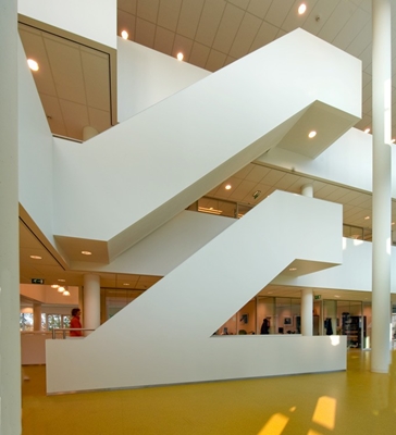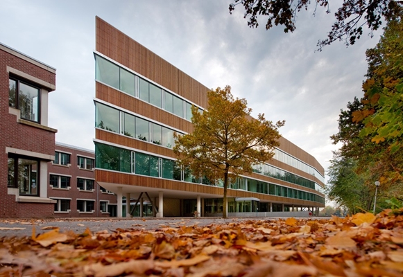 De eenduidige ‘halve maan’-vorm van de nieuwbouw maakt een duidelijk gebaar naar de campus en verleent daarmee het totale complex een eigentijdse uitstraling en identiteit. Daarnaast zorgt de gebogen gevel voor een zekere royaliteit en zicht op het bestaande gebouw. Zo ontstaat er een aangename ruimte tussen oud en nieuw.