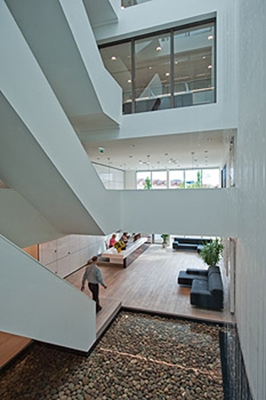 De grote ramen worden als het ware bij elkaar gehouden door wit stucwerk en tezamen vormen zij de schil. De verhouding tussen de grote ramen en het stucwerk verleent het gebouw een zekere spanning en daarmee wordt het een eigentijdse interpretatie van het modernisme.