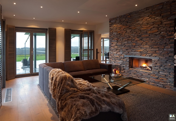 Dit alles resulteerde in een bijzonder woonhuis met een natuurstenen gevel, die zich als een kameleon naar de omgeving en de seizoenen voegt; uitbundig in de zomer en bescheiden in de winter. Het ontwerp van de tuin is opgenomen in het geheel en de sfeer van buiten is binnen voortgezet door de natuursteen door te laten lopen. Piet Jan van de Kommer tekende voor de interieurinrichting.