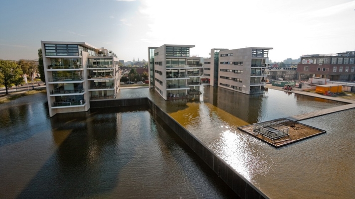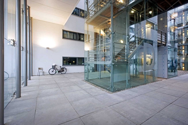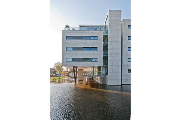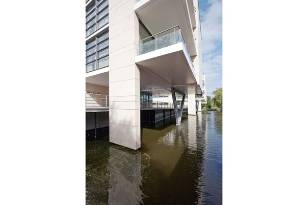 Voor het tweede aspect, de samenhang, bedachten we een oer-Hollandse oplossing: water. Op het dak van de ondergrondse parking werd een waterbassin geprojecteerd met zacht stromend water. Deze vondst geeft de vier afzonderlijke gebouwen de illusie van onafhan- kelijkheid, terwijl het water visueel juist een sterk bindend element is. Daarnaast zorgt het water- oppervlak voor een ongekend ruimtelijk gevoel.