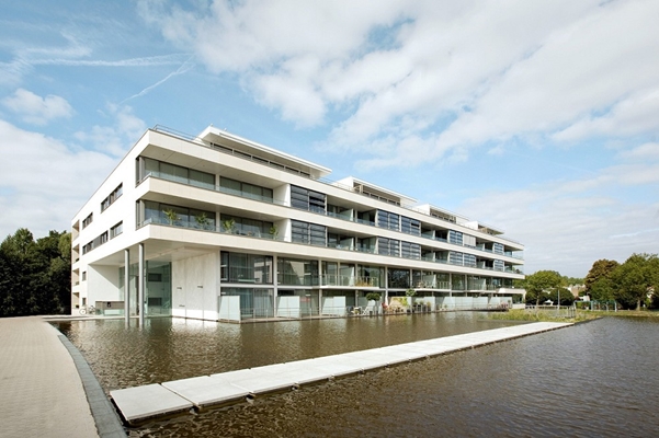 Zonder uitzondering hebben de gebouwen strakke horizontale lijnen en ogen ze transparant door het gebruik van veel glas, natuurlijke materialen en vides. Die kwaliteit wordt letterlijk weerspiegeld in het water. Dag en nacht.