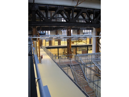 Zwevende volumes van praktijkruimten, leslokalen, kantoren en restaurant worden toegevoegd door een zorgvuldige inpassing rondom de bestaande monumentale constructieve elementen. Door de toepassing van veel glas en lichte industriële profielen en materialen profiteren deze volumes volop van de aanwezige hoogte (tot 21 m) en sfeer in deze enorme monumentale hal.