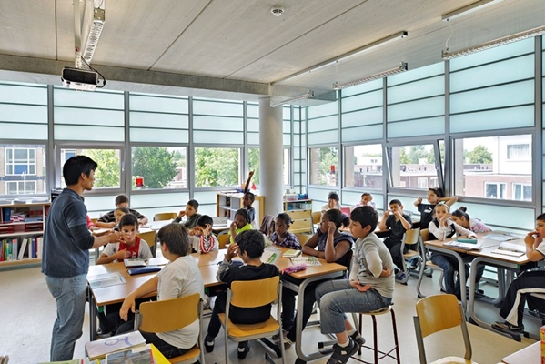 Twee basisscholen, een wijkcentrum voor jong en oud, kinderopvang en een sportzaal bundelen hun krachten in een compact en dynamisch gebouw: het multifunctioneel centrum (MFC) van de Vrijheidswijk in Leeuwarden. Het MFC is onderdeel van een stedenbouwkundig plan dat ons bureau in 2004 in opdracht van de gemeente Leeuwarden ontwikkelde. Het semi-transparante gevelmateriaal laat overdag voldoende getemperd daglicht toe en biedt in de avonduren met kunstlicht een levendig beeld, waardoor het gebouw fungeert als 'lantaarn' voor de wijk. De verschillende gebruikersgroepen zijn programmatisch zo georganiseerd binnen het gebouw dat ze zelfstandig kunnen functioneren, elk met een eigen ingang en met behoud van hun identiteit.