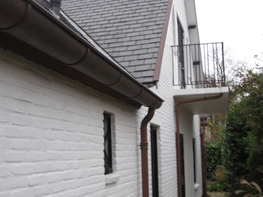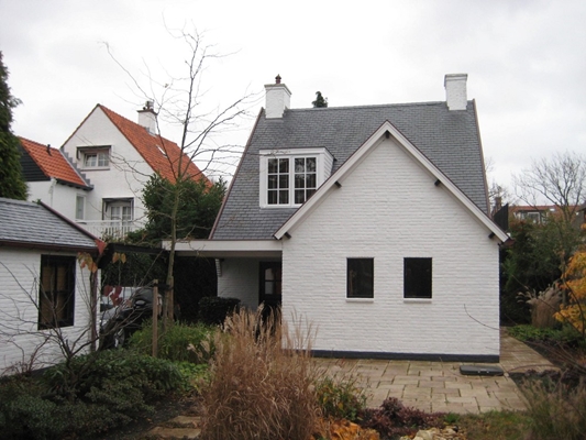 De materialisering en detaillering van de vernieuwde uitbouw is in overeenstemming met het bestaande: wit geschilderd metselwerk voorzien van donkere plint plus rollaag; donker geschilderde kozijnen met ondiepe negge plus rollaag; kap met gelijke dakhelling bedekt met soortgelijke dakbedekking, houten gootklossen en boeidelen met koperen windveer, mastgoten en hemelwaterafvoeren. De dakkapel is conform bestaand voorzien van gebroken wit houtwerk, kozijn en zijwangen.