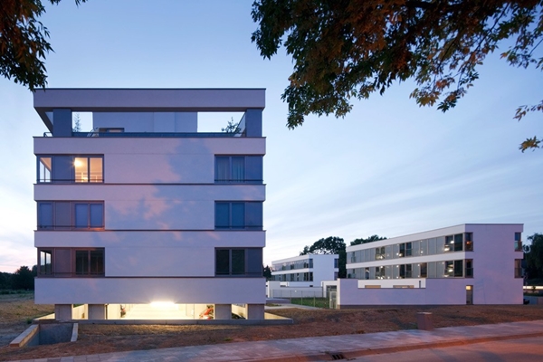 Het complex is een goeddeels symmetrische compositie die als het ware boven het weiland zweeft. Het hoofdvolume bevat 25 appartementen waarvan er twee grote penthouses met grote dakterrassen zijn. De twee kleine bouwblokken bestaan ieder uit twee woningen.(twee onder een dakvloer). Bijzonder aan het hoofdvolume , buiten de herkenbare , heldere en transparante architectuur zijn de drie meter brede toegangsgalerijen.