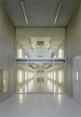 Door het beperkte budget is het centrale atrium samenhangend ontworpen volgens ruwbouw-esthetiek. De betonnen wanden blijven onafgewerkt, de plafonds zijn voorzien van een akoestische pleister, leuningen zijn grotendeels gegalvaniseerd en eenvoudige industriële armaturen zijn direct op de wand gemonteerd. Een complexe ruimtelijke eenheid ontstaat als gevolg, welke opzettelijk de ‘nieuwe armoede’ van het hedendaagse bouwen exposeert, maar ook viert.