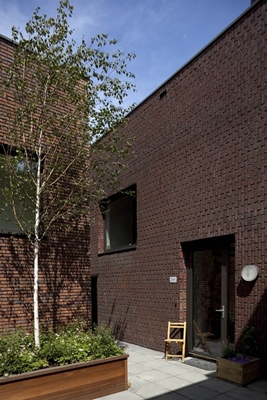 De opbouw van het bouwblok is aan de buitenzijde afleesbaar gemaakt; de twaalf gezinswoningen onderscheiden zich door verschillende kleur van de bakstenen gevels en metselverband en benadrukken zo het individuele karakter.