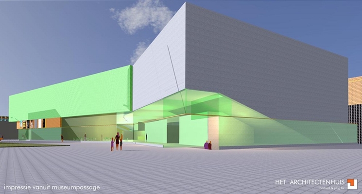 De nieuwbouw bestaat uit zes moderne bioscoopzalen. De zalen zelf zijn gesloten bouwvolumes waarvan er vijf stuks met de rug tegen het Huis voor Schoone kunsten zijn gezet. De zesde doos is gedraaid en verschoven naar de hoek van de locatie. Hierdoor ontstaat een spannende compositie van volumes die ruimte laat voor een grote foyer. Deze foyer is transparant en vanaf alle zijden van buitenaf zichtbaar, waardoor een uitnodigend karakter ontstaat. Door de zesde zaal te draaien kan de hoofdentree onder de zaal worden gemaakt waardoor de hoek van het gebouw wordt benadrukt en de entree vanaf het Caterplein goed zichtbaar is.