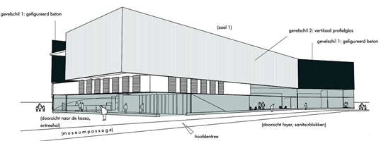 De bioscoopzalen naast het Huis voor Schoone Kunsten worden bekleedt met beton. De begane grond van de zalen wordt omringd door glazen panelen die aansluiten op de transparante foyer. De zaal op de hoek wordt bekleedt met matglazen U-profielen.