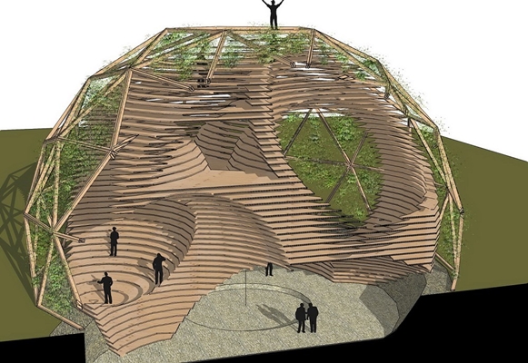 De in elkaar overlopende sferen zorgen voor vloeiende lijnen en organische vormen. Met koepels en bollen laat het groene Panteon het universele, het gemeenschappelijke zien.
