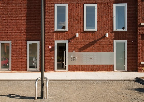De kozijnen liggen in een vast patroon boven en naast elkaar, het terugliggend metselwerk rondom de kozijnen is per appartement wisselend aangebracht. Dit metselwerk is staand aangebracht in een bijzonder verband en platvol gevoegd. Het standaard halfsteens metselwerk heeft een diep terug liggende voeg. Deze wijze van uitvoering versterkt op ambachtelijke wijze het verschil tussenbeide.