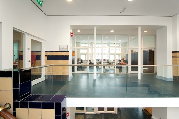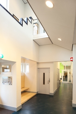 een statig gebouw, met hoge ruimten, maar ook donker en gesloten. Rijen gesloten lokalen langs lange, hol klinkende, gangen. Toegespitst op het klassikale onderwijs van toen en niet op het moderne onderwijs van nu met een afwisseling van klassikaal, groeps en individueel onderwijs. Onze strategie is simpel: openbreken! Meer licht, meer lucht en meer openheid. Door openingen te maken tussen klaslokalen en gangen, door een groot deel van de bestaande hal te slopen en door op strategische plaatsen openingen te maken is het gebouw veel ruimer en lichter geworden. De uitstraling van het klassieke gebouw hebben wij in het interieur gebruikt als basis voor een eigentijdse uitstraling. De in ere gehouden onderdelen zijn aangevuld met materialen als gietvloeren, bamboe meubels en, op strategische plekken, heldere kleurvakken. Architectuur beperkt zich niet tot vormgeving. Een goed klimaat en comfort zijn essentieel voor een goede beleving, zeker in een school. Gebruik makend van de oorspronkelijke ventilatieschachten is een geheel nieuw mechanisch ventilatiesysteem ingebouwd waardoor het luchtklimaat in de school sterk is verbeterd. En door akoestische maatregelen zijn de galmende ruimten getransformeerd tot rustige ruimten. Kenmerkend voor dit project is het hoge afwerkingsniveau. Door voldoende budget hoefden de gekozen oplossingen niet telkens vervangen te worden door goedkopere varianten en konden ook de vaste meubels uitgevoerd worden in de lijn van het totaalontwerp